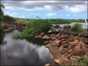 These fish passage improvement works were co-funded by Mackay Regional Council and Reef Catchments NRM group, and are anticipated to provide significant increases to the biodiversity of this regionally significant wetland complex. Amongst an abundance of birdlife, crocodiles and numerous other fish species, the wetlands provide substantial habitat for young-of-year barramundi recruits. Extremely high numbers of juvenile barramundi migrate into these lowland wetlands during wet-season flows, where they grow rapidly due to the abundance of food and refuge habitat. These fish then migrate back to estuarine habitats as sub-adults to complete their life-cycle. Barramundi are a valuable fisheries resource throughout the region and broader central Queensland, with aquatic connectivity improvements to freshwater and wetland habitats a key strategy in increasing populations of the species for the benefit of commercial, recreational and indigenous fisheries. Due to the high numbers of juvenile barramundi migrating through the fishway and into the wetlands, local residents have nicknamed the fishway the ‘barra ladder’.