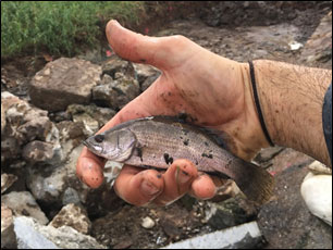 Figure 1. Left; Defective fishway (towards left of image) requiring repairs with the barrier height also visible showing 1.2m difference between upstream and downstream water levels. Right; one of 14 juvenile barramundi salvaged during repair works from the pool immediately beneath the fishway. These fish were congregating beneath the fishway, however due to the defects were unable to use the fishway to reach the upstream wetlands. Also trapped below the fishway were giant herring, sea mullet and bullrout.
