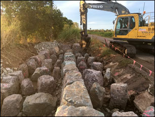Figure 2. Top row; causeway prior to fishway repair works and wall rock replacing smaller original rock. Middle; fishway upon completion of repairs before (left) and after (right) new concrete being poured to seal the pools and solidify the structure. Bottom; fishway during first flows upon opening up causeway after concrete had set.