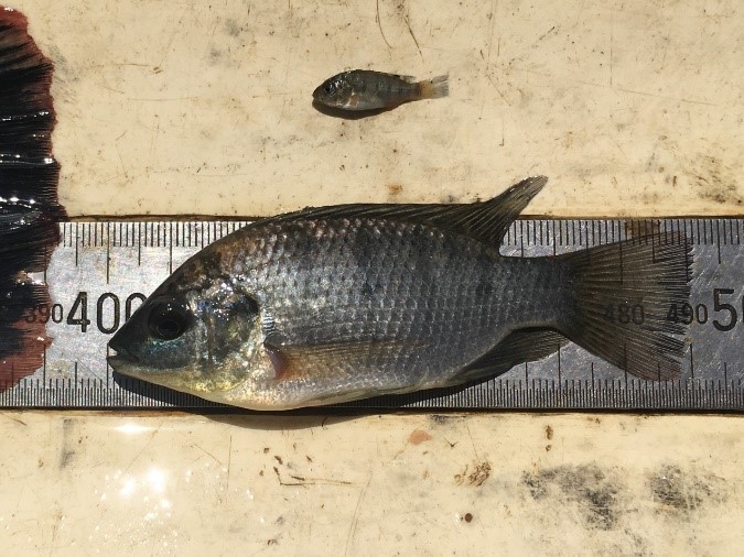 Above the introduced pest fish, tilapia, which were caught in the Gooseponds during the monitoring.