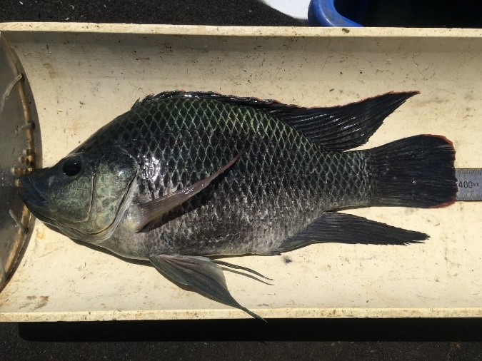 Above the introduced pest fish, tilapia, which were caught in the Gooseponds during the monitoring.